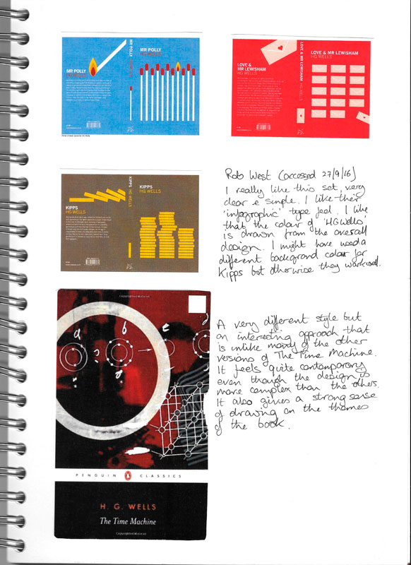 Exercise (p.40 OCA Graphic Design): Your brief is to design a stunning and contemporary cover for one of the 20th Century’s most acclaimed authors, HG Wells. When you have a range of ideas and have notes in your learning log, make some rough drawings or sketches to show your ideas.